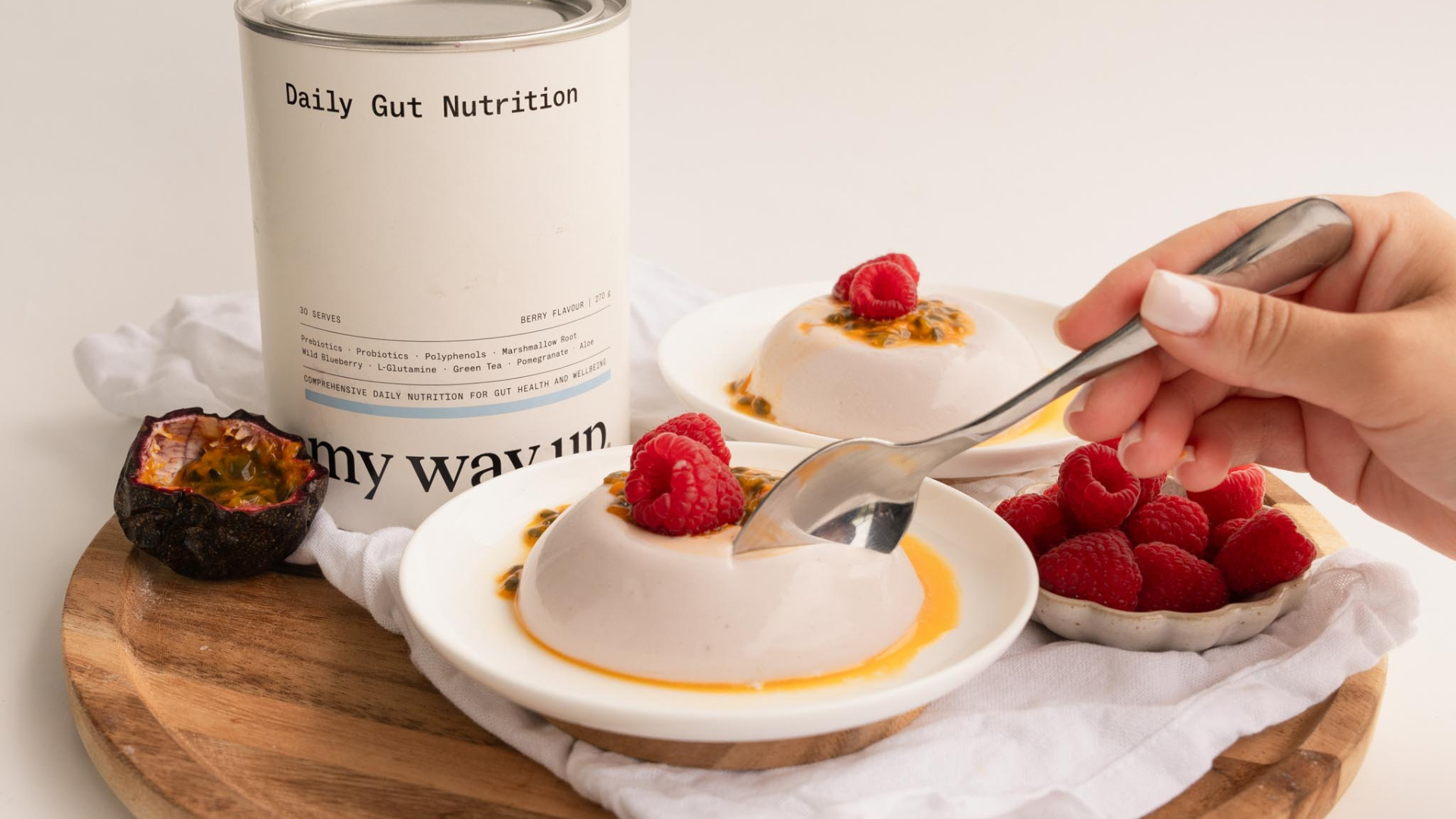 Indulge in a creamy hibiscus berry panna cotta made with coconut milk and a hint of cinnamon for a delightful gut-loving dessert. Hibiscus adds vibrant flavor while offering health benefits like lowering blood pressure, improving digestion, and providing powerful antioxidants. The ingredients in Daily Gut Nutrition enhance this treat, promoting gut health and overall wellness. With the addition of cinnamon, known for its anti-inflammatory properties, this panna cotta is as nourishing as it is delicious. Plus, gelatin aids digestion, heals the intestinal lining, and boosts collagen for skin and joint health.